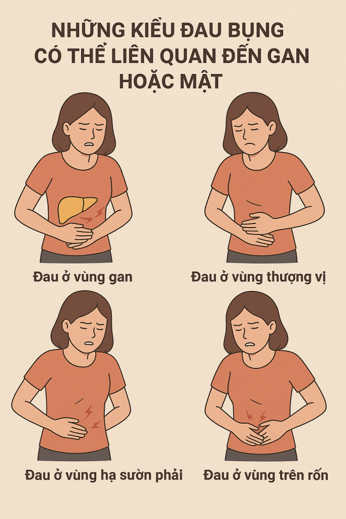Do vị trí giải phẫu này, hầu hết các cơn đau liên quan đến gan và mật đều xuất phát từ vùng Hạ sườn phải (vùng bụng bên phải, ngay dưới xương sườn). Tuy nhiên, tính chất cơn đau (âm ỉ, dữ dội, hay quặn thắt) và hướng lan của nó mới là chìa khóa để phân biệt từng loại bệnh lý.