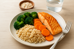 Ăn nhiều rau xanh, trái cây tươi, ngũ cốc nguyên hạt, cá béo (cá hồi, cá thu).
